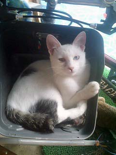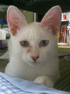 左目が水色、右目が緑色の美しいオッドアイ。しかし目脂がひどい。