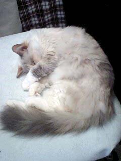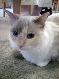 フサフサした毛並。泣き声が普通のニャーンではなく、すごく高い声で美しいのが特徴的。